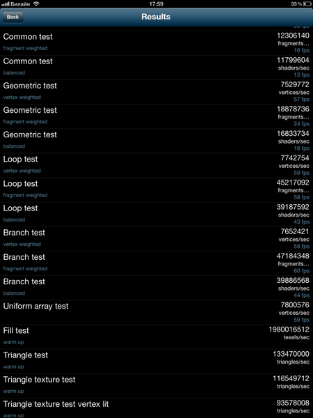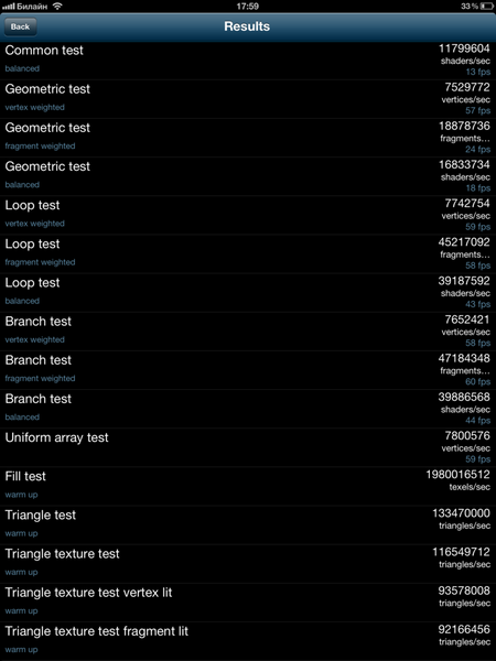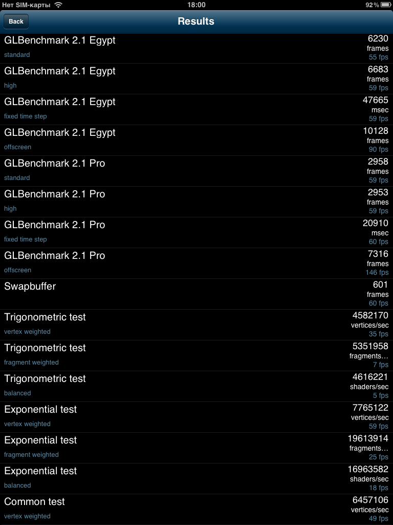 Производительность железа нового планшета, увы, осталась на прежнем уровне, новых ощущений от скорострельности получить не удастся. Точнее, графическая подсистема стала вдвое быстрее, чтобы покрыть потребности дисплея с огромным разрешением. Из результатов GLBenchmark видно, что новый iPad быстрее iPad 2 в некоторых тестах в полтора-два раза: