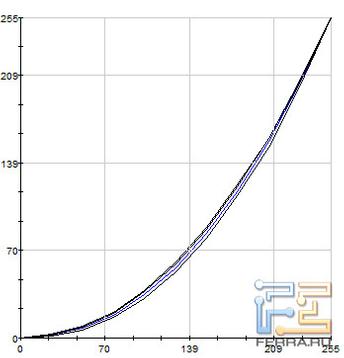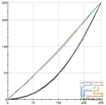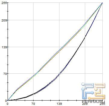 На иллюстрациях, приведённых ниже, отображены гамма-кривые (чёрные графики), полученные до и после калибровки дисплея, целевая гамма 2,2 (светло-синий график) и коррекция для каждого цвета (красный, синий, зелёный).