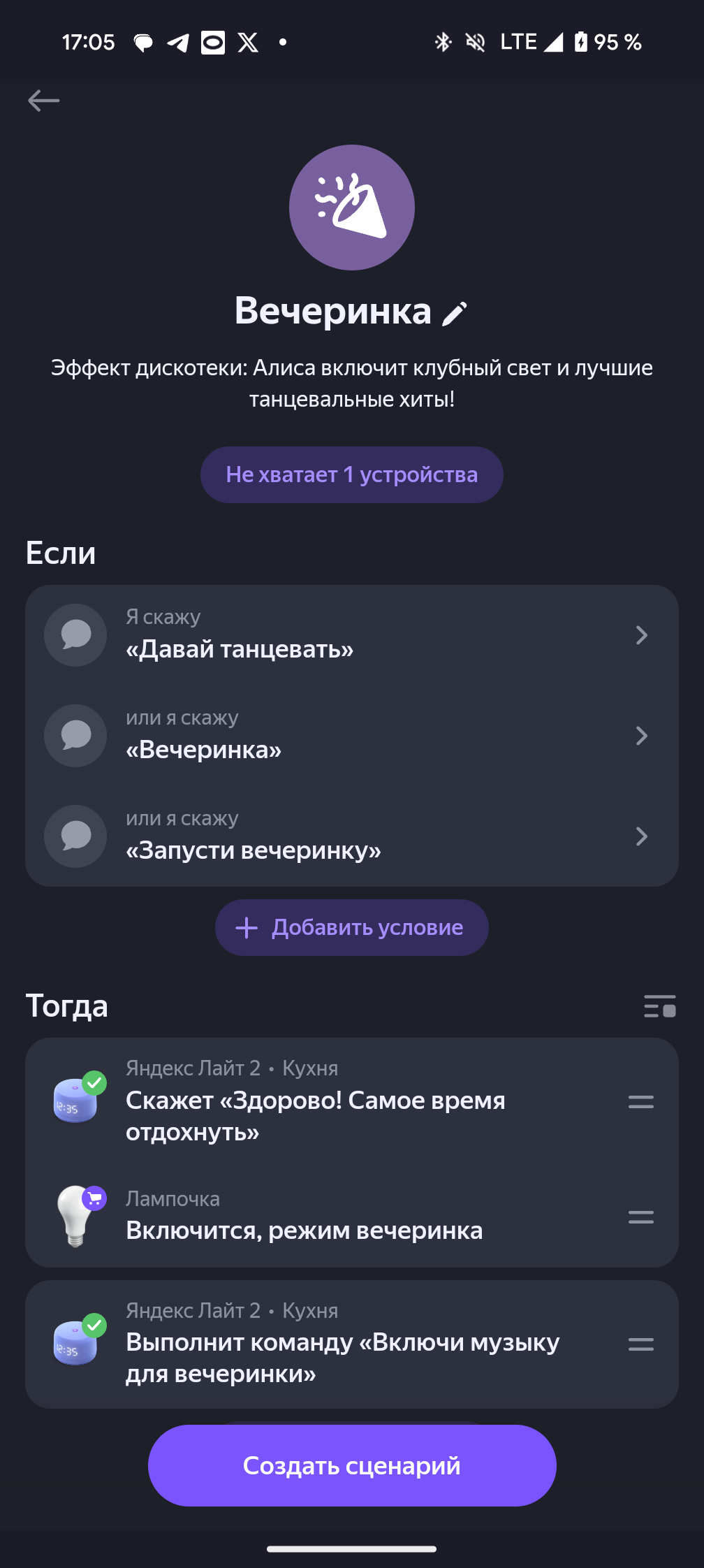 Во-первых, вам не нужно долго думать каким образом и при каких условиях связать всякие умные штуки, придумывая десятки сцен из повседневной жизни: от ухода на работу до вечеринки с друзьями. В приложении сразу есть готовые решения, которые сильно упрощают эту задачу, а значит порог входа в «умные» дома стал ещё ниже. Например, меня всегда пугала необходимость кропотливой и долгой настройки всех этих лампочек и розеток, чтобы они понимали меня с полуслова.