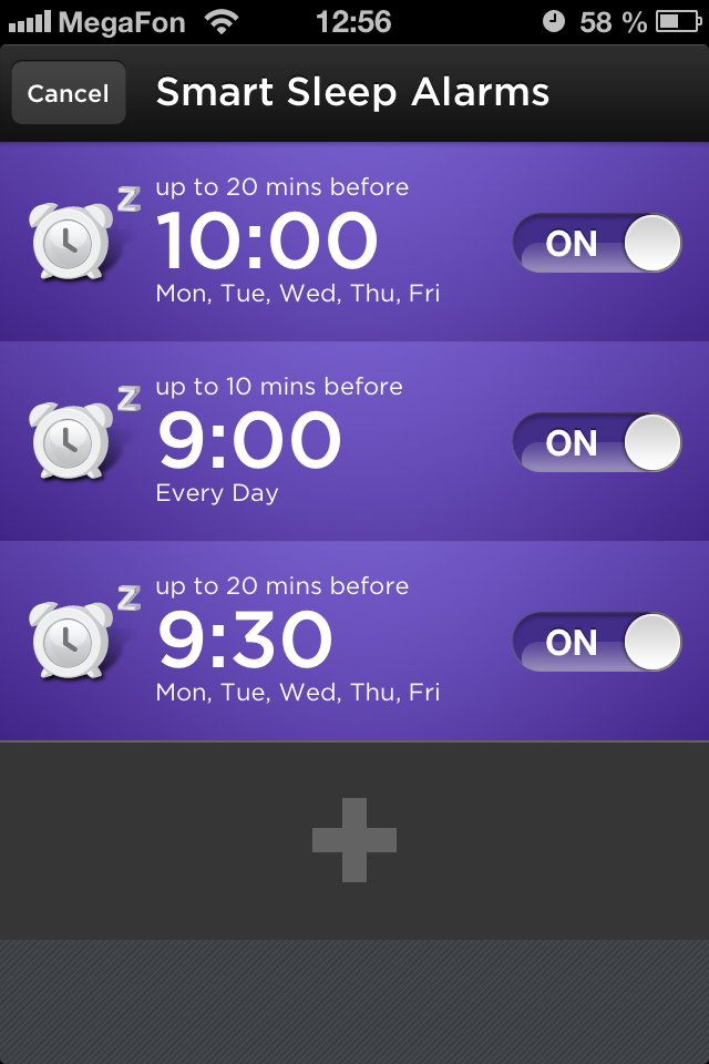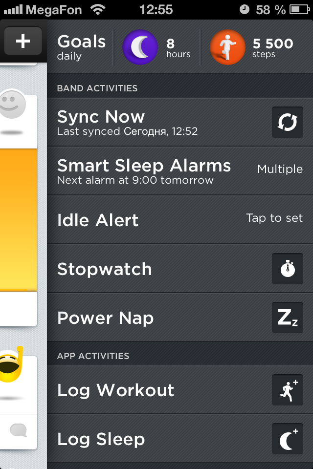 Помимо трекера активности, в UP встроена еще одна очень важная функция. Да-да, это я про будильник. Разумеется, динамика в браслете нет, зато есть вибромотор. Выставляете в приложении нужное время и допустимый период, в который вас обязательно нужно разбудить. Например, 7-00 и полчаса на пробуждение. Утром браслет будет отслеживать вашу активность и в период с 7 до 7-30 разбудит именно в тот момент, когда будет фаза лёгкого сна. Пробуждаться в этой фазе очень удобно и легко, поэтому даже от вибрации на запястье вы запросто сможете открыть глаза и окончательно проснуться. Хотя мне удавалось пару раз не раскрывать глаза, а просто нажимать на кнопочку и продолжать спать дальше. Так что панацеей от синдрома «проспал работу» UP не станет; нужна всё-таки собственная сила воли. Но вот помочь в борьбе с ним браслет, несомненно, может.