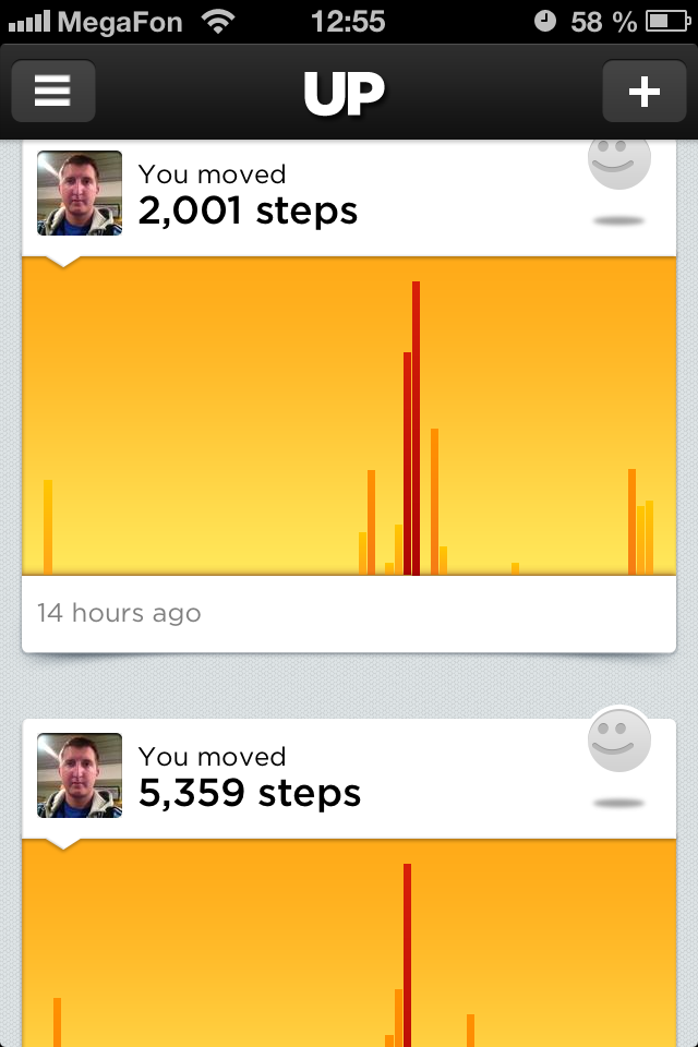 Приложение выглядит слегка игрушечно, зато представление данных очень информативное. Jawbone UP действительно обрабатывает кучу полученной информации и выдаёт её в красивом виде. Полученными результатами, кстати, можно делиться в Twitter или Facebook. Но не злоупотребляйте. Очень мало найдется людей, которым реально интересно, сколько вы сегодня сделали шагов.