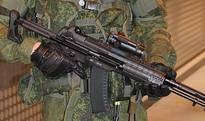 В то время для спецподразделений был разработан АК-400, который решал проблемы серийных АК-74. Этот автомат получал телескопический приклад на манер карабинов М4 — мушка была перенесена на газоотвод, дульный компенсатор получил на срез стеклобой в форме короны.