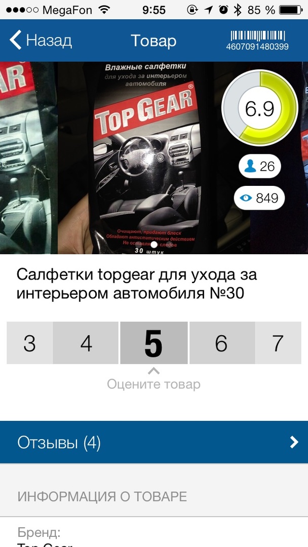 Мы проверили работу сервиса при покупке омывающей жидкости и влажных автомобильных салфеток. По такой погоде расход омывайки был просто запредельным, особенно с учетом того, что при каждом пятом касании ручки автомобиль очень щедро омывал фары.Для того, чтобы иметь возможность оставлять отзывы и оценки, в приложении нужно зарегистрироваться. Это быстро и просто, не сложнее, чем регистрация на каком-нибудь форуме. Затем с помощью встроенной камеры смартфона нужно отсканировать штрих-код, немного подождать и получить информацию о товаре и отзывы покупателей. Бывает так, что продукта еще нет в базе – тогда приложение предложит вам добавить его самостоятельно. Не лишним будет добавить фотографию упаковки, так пользователям будет проще распознать товар.