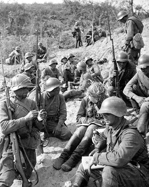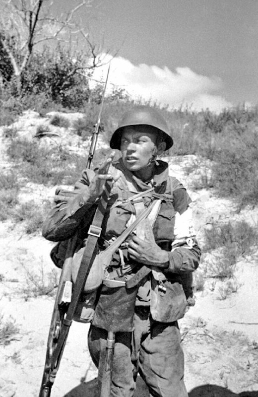 Но штучно такие шлемы встречались на хрониках и фото даже в 1943 и 1944 гг. (полагаю бойцы ценили раритеты, возможно, намекавшие на их нехилый боевой опыт). Да и разгром Квантунской армии не обошёлся без них — бойцы на Дальнем Востоке во многом были экипированы по образцу 1939 года.