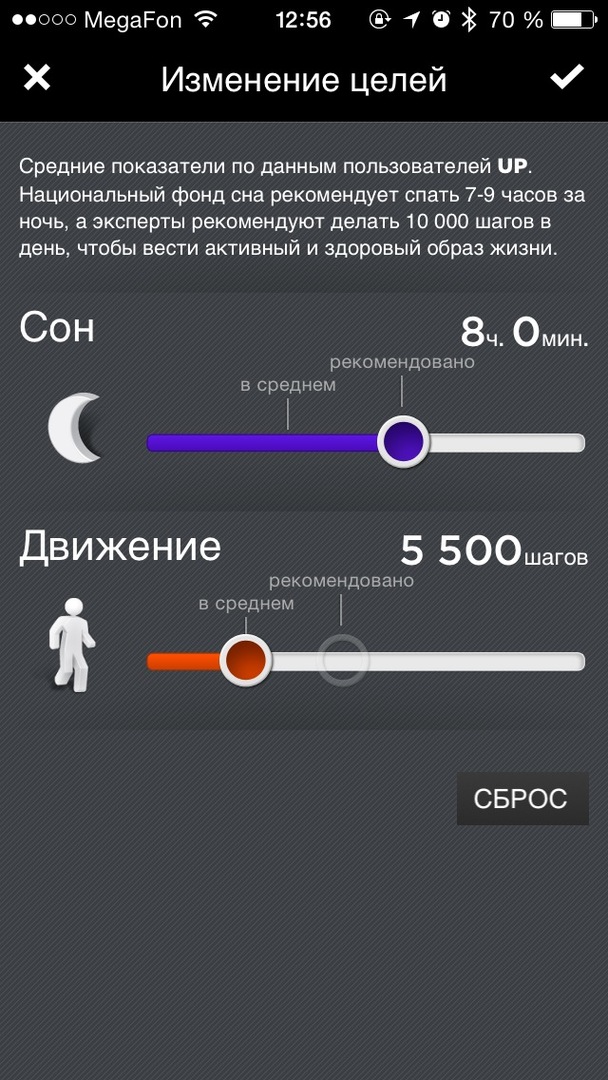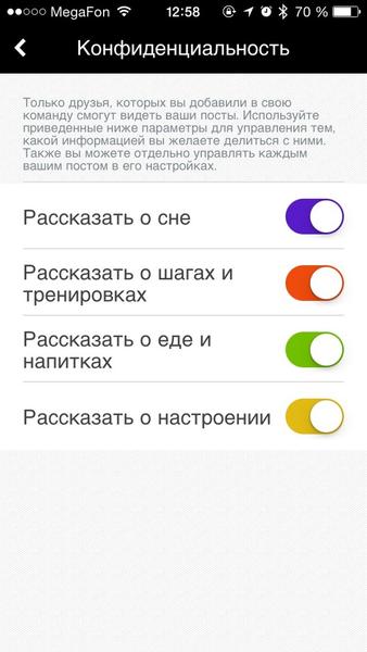 В настройках можно установить свои цели, а также включить или отключить оповещения о различных событиях. Здесь же настраивается конфиденциальность. Ведь UP — это социальное приложение, и все ваши друзья могут следить за вашей активностью вместе с вами. Если вы хотите сохранить данные в тайне, то эту функцию лучше выключить.