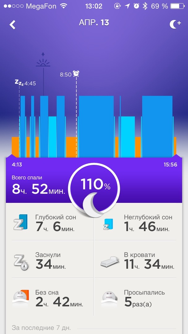 Но более интересные графики формируются по результатам анализа сна. Если в течение дня вы примерно знаете, как двигались и что делали, то ночная статистика всегда интереснее.