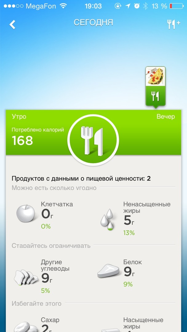 Вручную указывать в приложении можно не только виды спорта, но и пищу. Да-да, в обновлённой программе можно ввести то, что вы съели. Конечно, холодца или драников вы тут не найдёте, приложение пока не настолько адаптировано, но всякие овощи, фрукты, мясо — запросто. Просто выберите нужное блюдо, укажите его объем — и это тоже отразится на графике статистики.