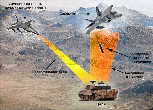 Пилот с помощью лазерного целеуказателя наводится на цель, а корректируемая бомба принимает отражённый импульс и точно знает куда падать (точнее, планировать). С ракетами, которые имеют двигатель и куда лучше управляются, это работает ещё эффективнее.