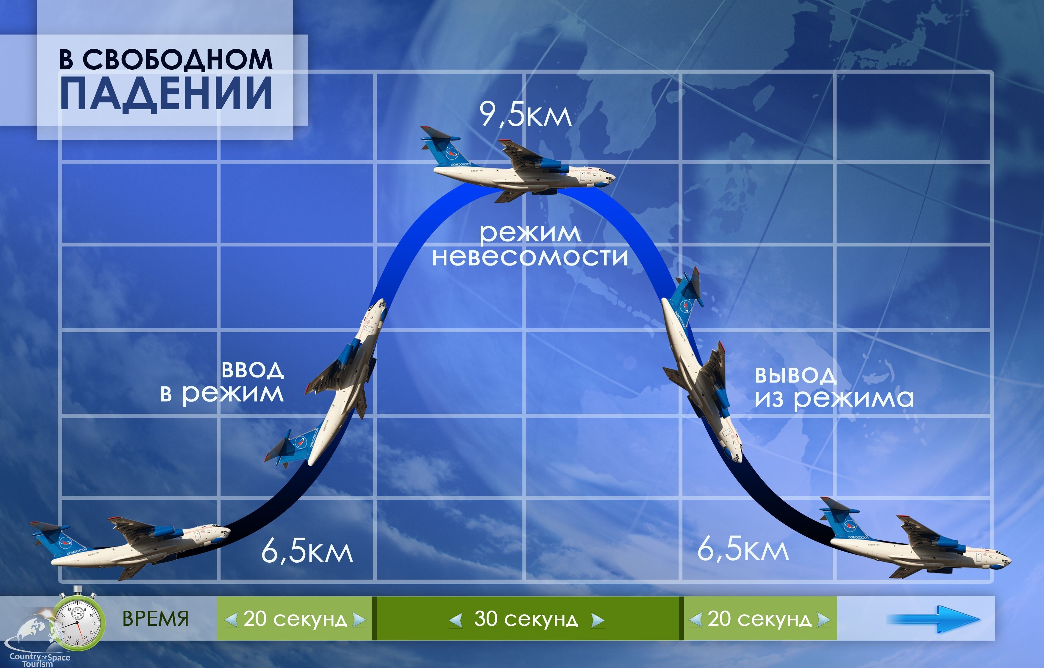 Когда самолёт закладывает очередной вираж, борт погружается в невесомость, которая длится около 22-25 секунд. Именно тогда будущие космонавты проводят необходимые тренировки и выполняют операции.