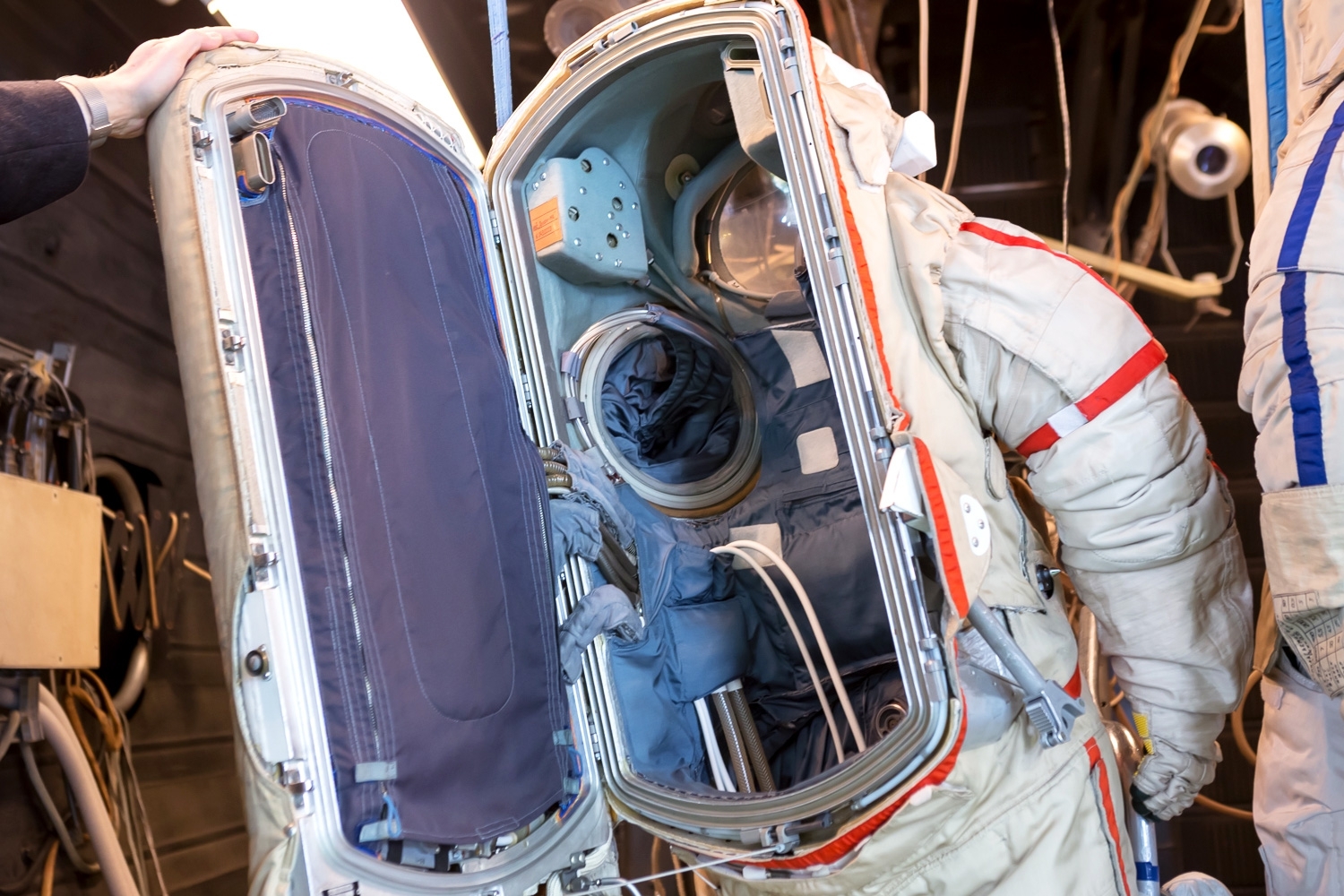 Кстати, этот костюм не надевают в привычном понимании этого слова — в него заходят. На спине скафандра есть специальный люк, который является одновременно и ранцем — в нём находятся системы жизнеобеспечения.