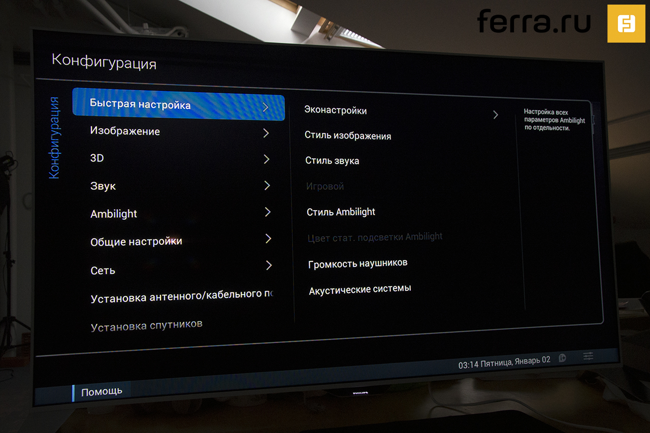 Как всегда, продвинутые модели Philips могут похвастать поддержкой технологии Ambilight. Конкрентно в 48PFS8209/60 используется 4-сторонняя версия. В соответствующем меню настроек присутствует множество режимов работы. К тому же Ambilight умеет подстраиваться под цвет стены. У нас в редакции даже разгорелся спор на тему этой технологии. Лично я считаю, что Ambilight не способствует улучшению восприятия изображения, демонстрируемого на экране. Однако, как показали дебаты, есть и противоположное мнение.