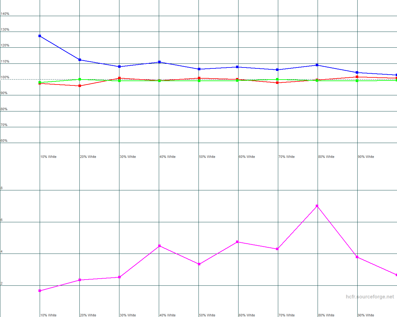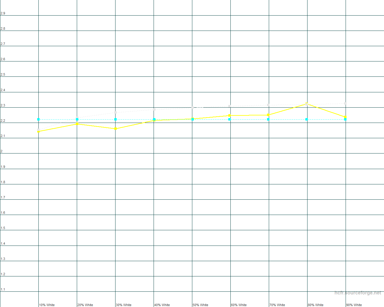 В первом режиме гамма составила 2,18, во втором — 2,21. Увеличение параметра гаммы на три пункта подняло этот показатель до значения 2,38. Напомню, что увеличение гаммы ведет к затемнению картинки, уменьшение — к осветлению. Идеальными параметрами являются значения в пределах между 2,2 и 2,4.