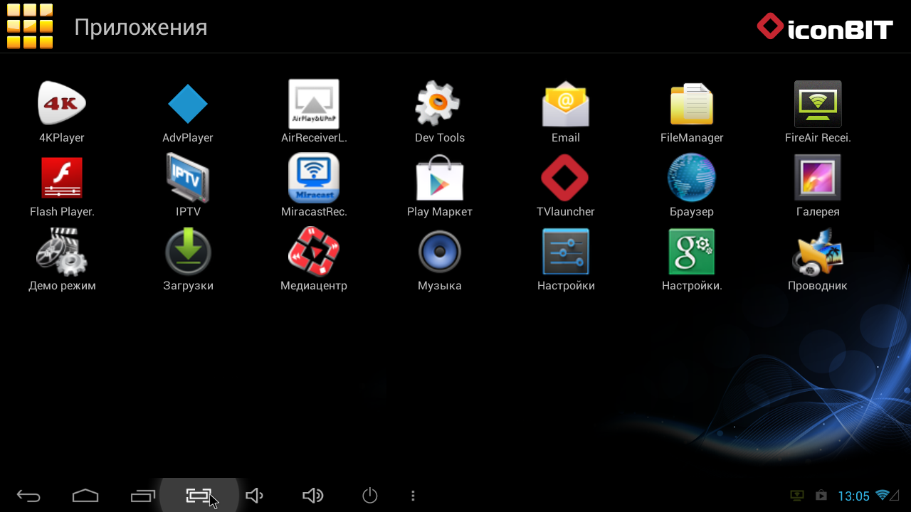 Оболочка системы обладает единым для медиаплееров IconBit интерфейсом, все настройки дизайна в котором сводятся к выбору приложений и расстановке ярлыков в удобном порядке. Впрочем, дизайн приятен глазу, а скорость работы в нашем случае оказалась разумной.