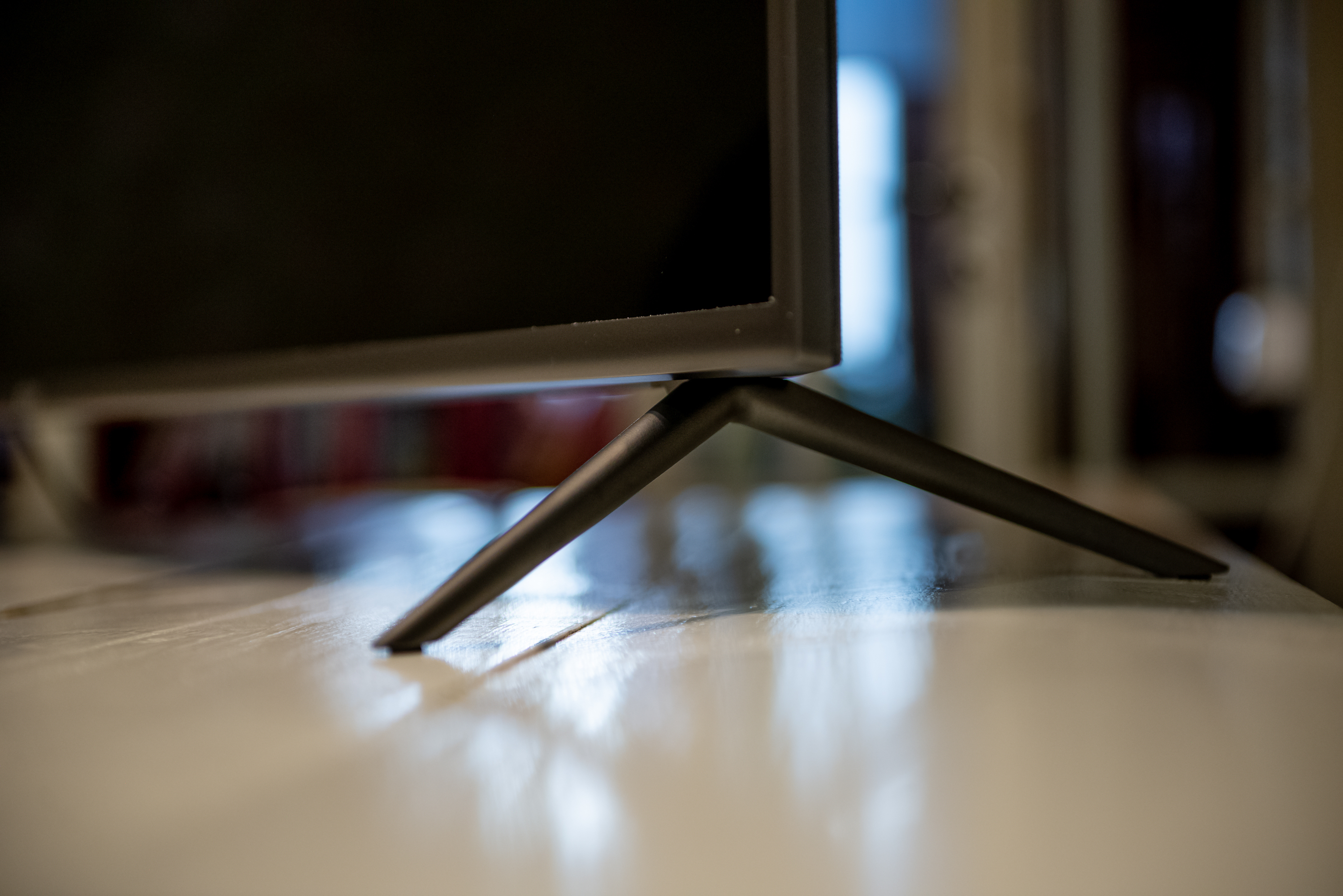 Короче, рассказывать особо не о чем: всё матовое, «блестяшек» и «рояльного лака» производитель нигде на корпусе не влепил, и спасибо ему за это. По поводу материала для ножек — мнения редакции разделились. Кто-то считает, что это стилизованный пластик, кто-то — что бюджетный металл. В любом случае, под весом телика они не гнутся, руками их даже при желании пополам не сломаете, крепятся к корпусу при помощи инструмента (руками болты не закрутить, а жаль — у конкурентов обычно встречаются винты с барашковой головкой, которую можно ухватить пальцами и прикрутить без ковыряния шестигранником, который хоть и в комплекте, но до переезда телевизора в новую квартиру 100% потеряется).