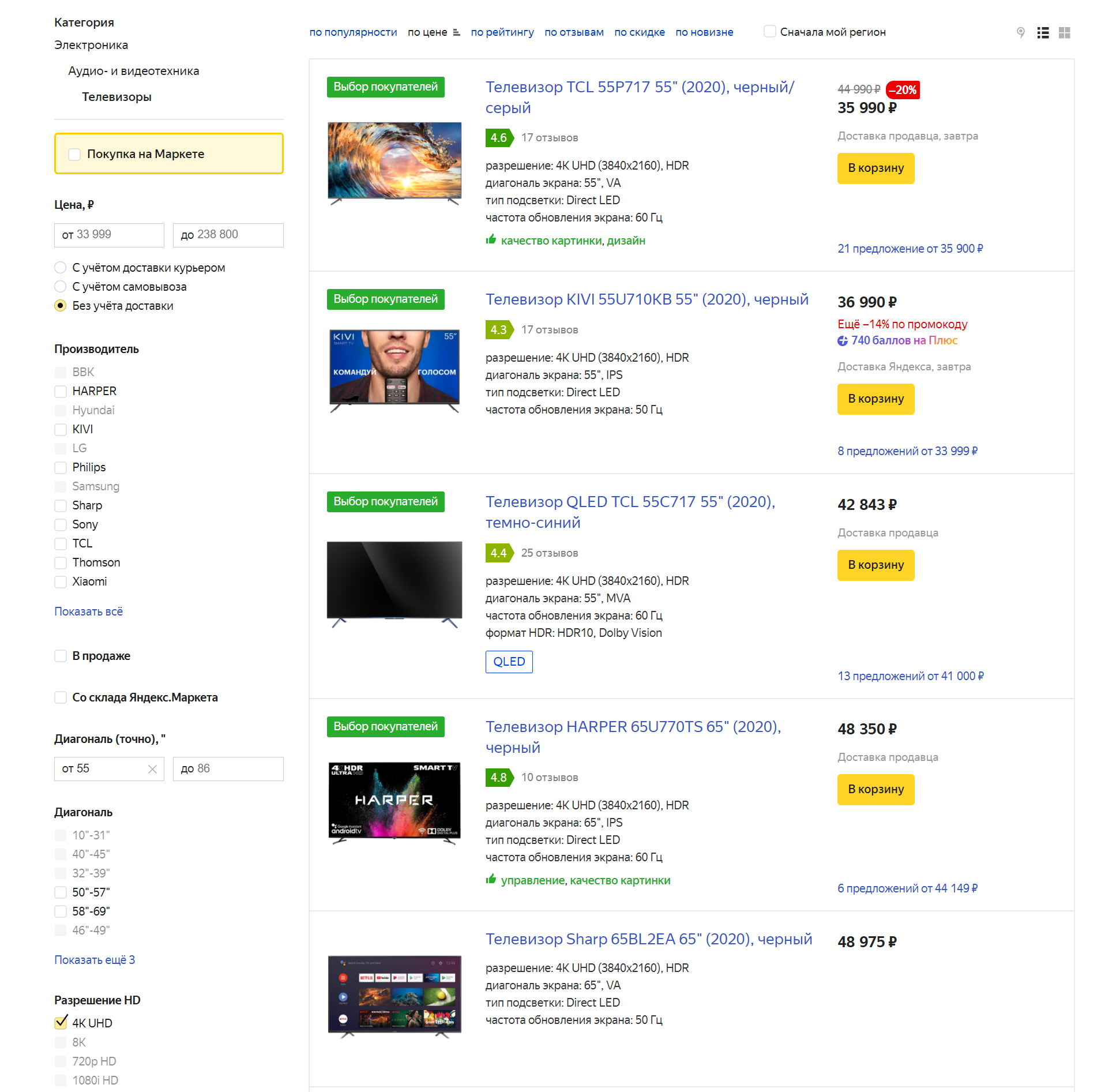 А вот Kivi 55U710KB 55" стоимостью 36990 рублей как раз сегодня будем крутить и разбираться, отличаются ли ожидания от реальности. Мы ведь всё правильно выбрали в конфигураторе Яндекса, значит и телик должен быть достойным по качеству? Или нет?
