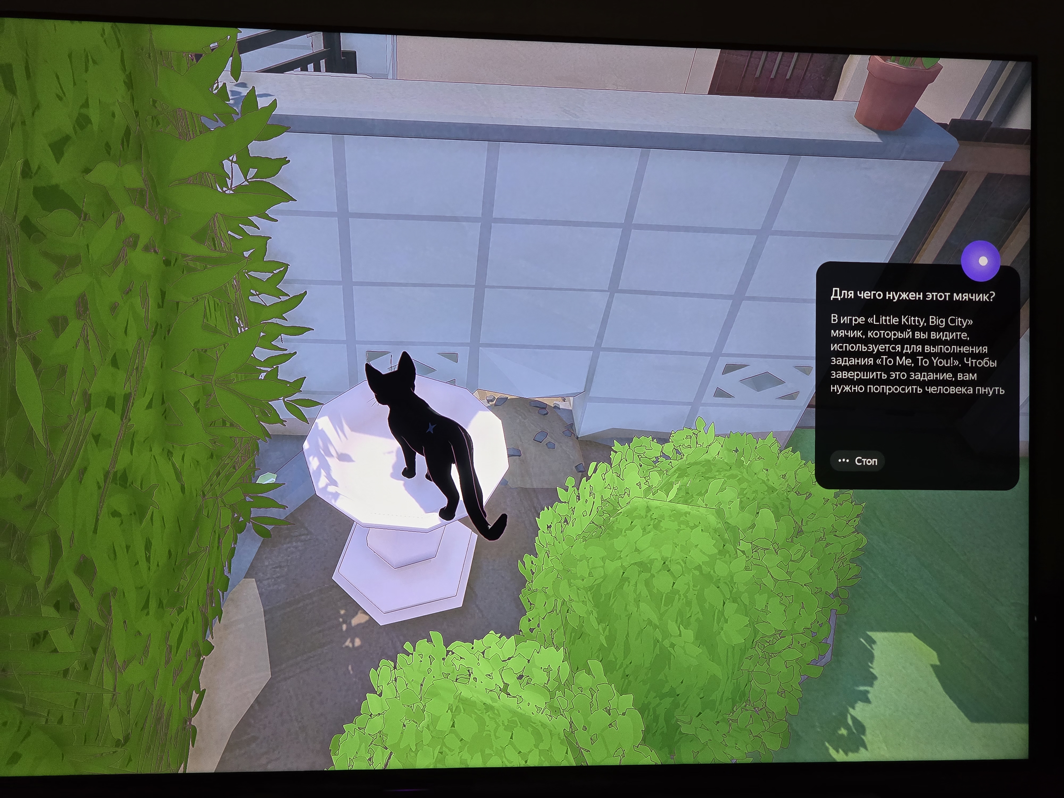 Затем я решил усложнить задачу и зашёл в Little Kitty, Big City. Я давно не играл в эту игру и ничего в ней не помню, так что в первую очередь я поинтересовался — как пройти дальше (имея ввиду перейти через лужу). И вот тут начались странности: сначала Алиса решила, что я всё ещё играю в Astroneer, хотя я игру закрыл (не просто переключился на другую, а именно закрыл, чтобы она даже в Quick Resume не осталась). При повторном вопросе Алиса сказала, что я, по-видимому, нахожусь в переулке и дала общие правила для прохода переулков (идите прямо и ищите что-то интересное и с чем можно взаимодействовать).